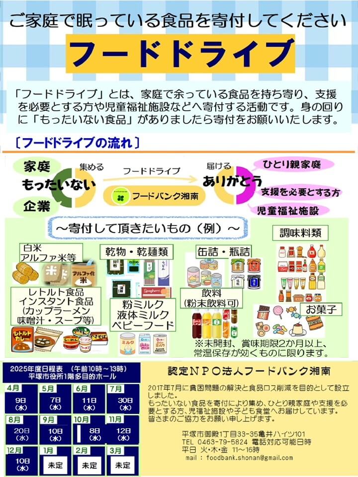 9月10日水曜日、平塚市役所1階多目的スペースにてフードドライブ(食品を集める活動)を実施いたします。