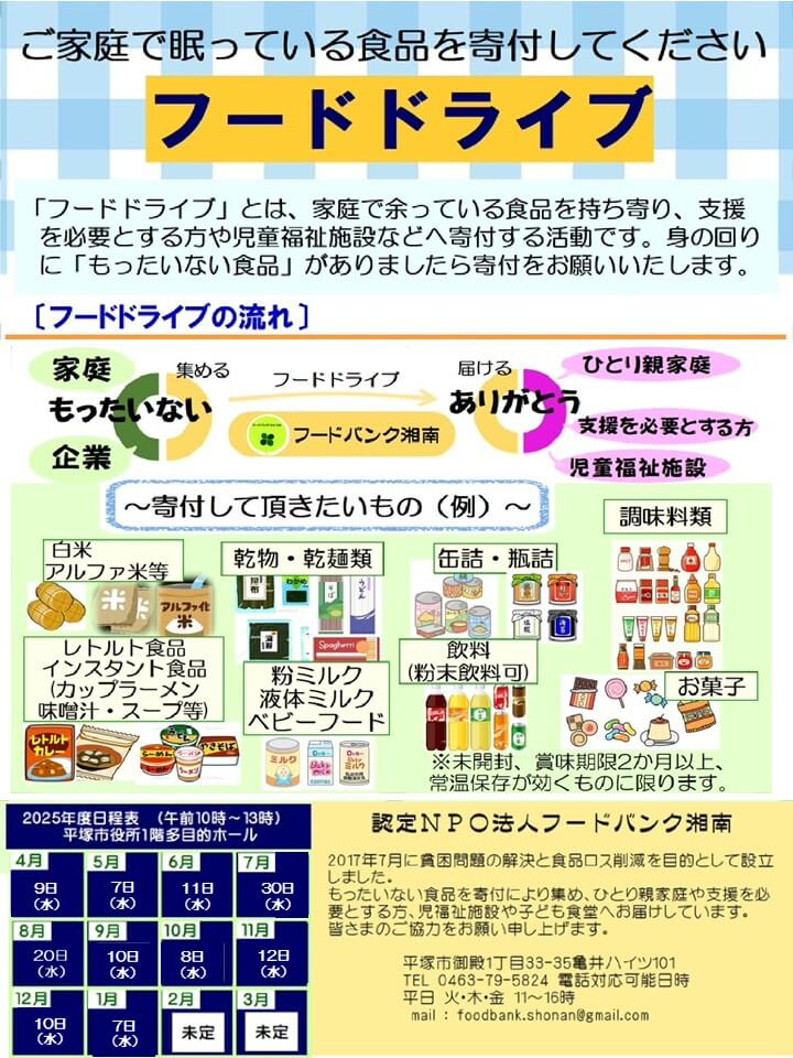 10月8日水曜日、平塚市役所1階多目的スペースにてフードドライブ(食品を集める活動)を実施いたします。