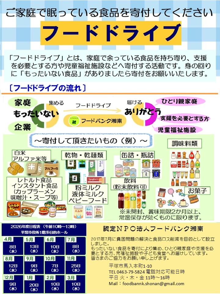 寄付受付場所(フードバンク湘南事務所):〒254-0024神奈川県平塚市馬入本町1-10